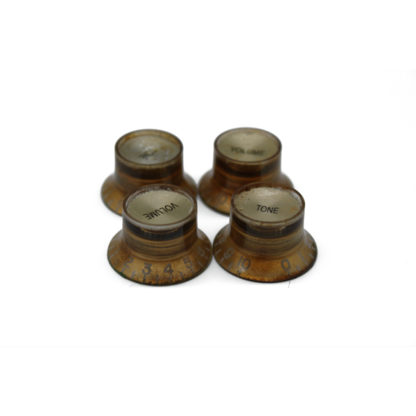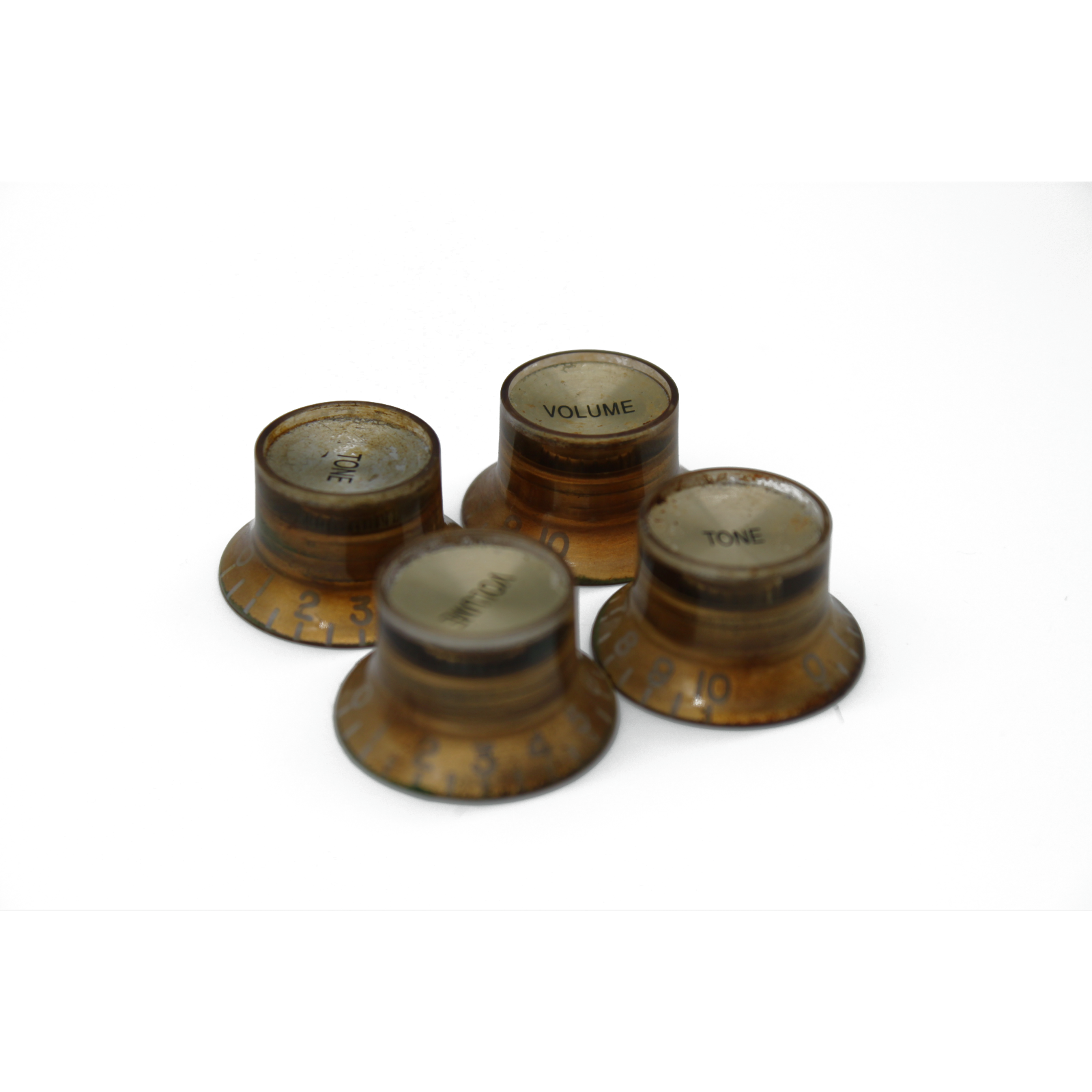 Set of four relic’d gold reflector top hat knobs for tone and volume controls. Manufactured from polished resin, each knob shows ambering that mimics the natural yellowing of plastic over time, paired with green oxidized numbering and a gold reflector insert for a classic look.